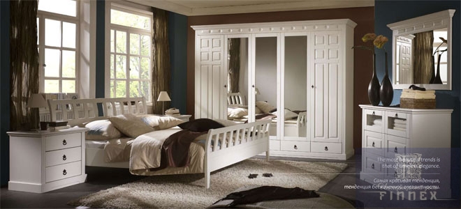 Спальный гарнитур финской фабрики Эдинберг. Выполнен из массива березы. Мебель возможна в двух цветах — орех и белый. кровать 160×200 см .тумба прикроватная 50×54×42 см .комод 116×89×49 см шкаф 170×212×64 см220×212×64 см 270×212×64 смзеркало — 124×80 см.
