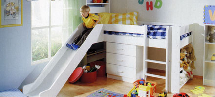 Кровать KID с комплектующей мебелью образует функциональный комплект для малой площади. Под лежанкой можно устроить место для хранения вещей. Комод удобен и безопасен в эксплуатации имеет ящики на металлических салазках.Для более буйных игр предназначена прочная горка.Цвета: натуральная сосна или белый.
