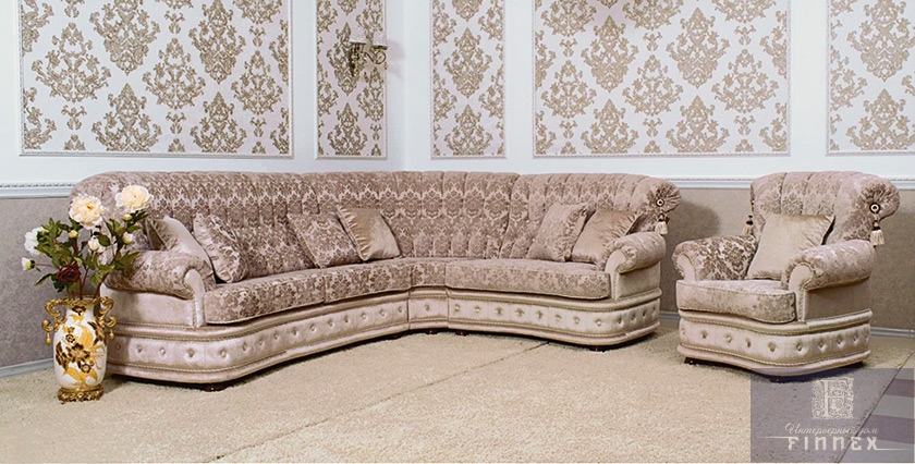 Francesca — диван угловой 5-ти местный с декором (3у2) 300×250×110, Диван угловой 4-х местный с декором (3у1) 300×200×110, кресло с декором 110×110×110 Диван и кресла в дворцовом стиле от одного из лучших производителя России. Комфортная мягкая мебель в классическом итальянском стиле, каркас — натуральное дерево. Большой выбор обивочных тканей.